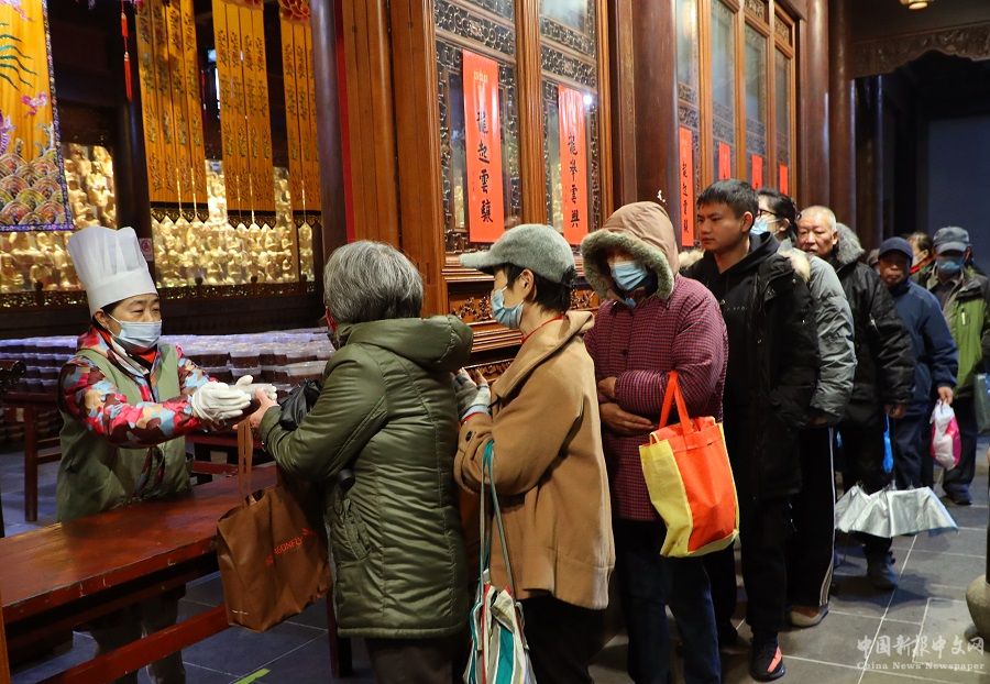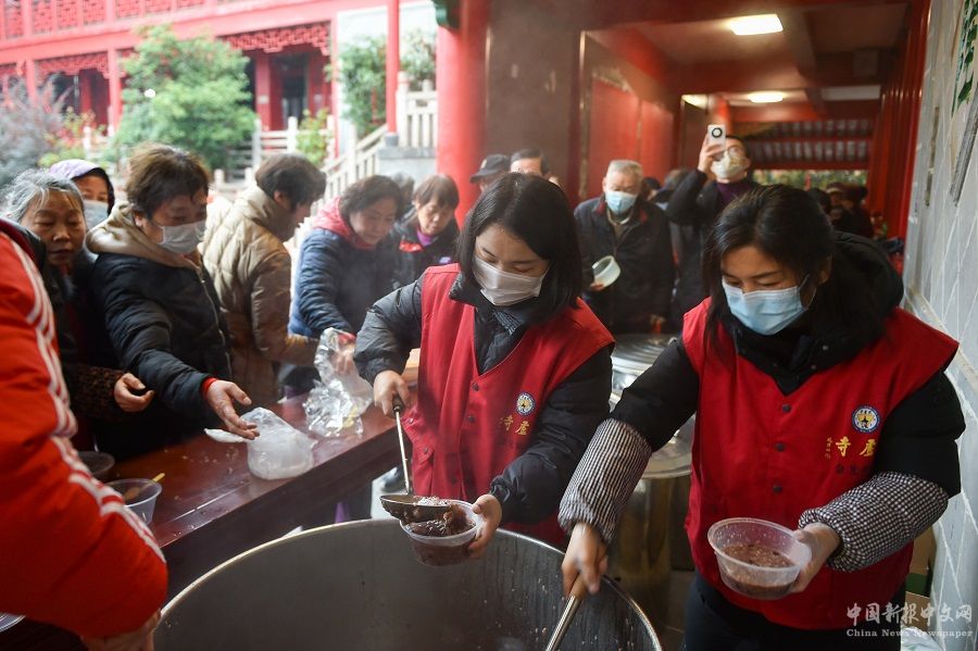 1月18日,江蘇省南京市玄武區(qū)毗盧寺,志愿者為市民免費(fèi)發(fā)放臘八粥。方東旭 攝
