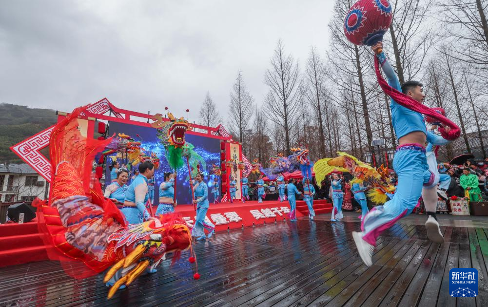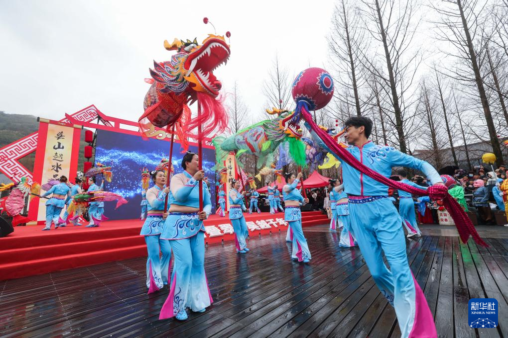 1月20日,演員在太湖源鎮(zhèn)指南村村落景區(qū)表演傳統(tǒng)舞龍踩街。