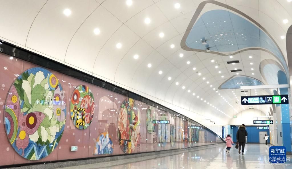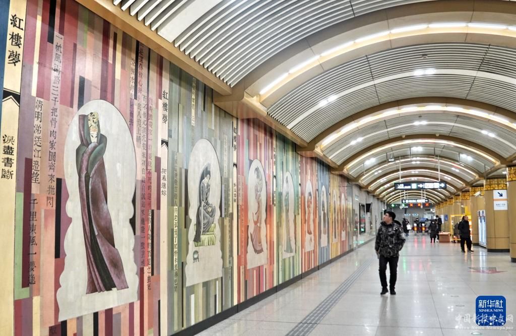 乘客走過牡丹園地鐵站內(nèi)的壁畫(1月20日攝)。