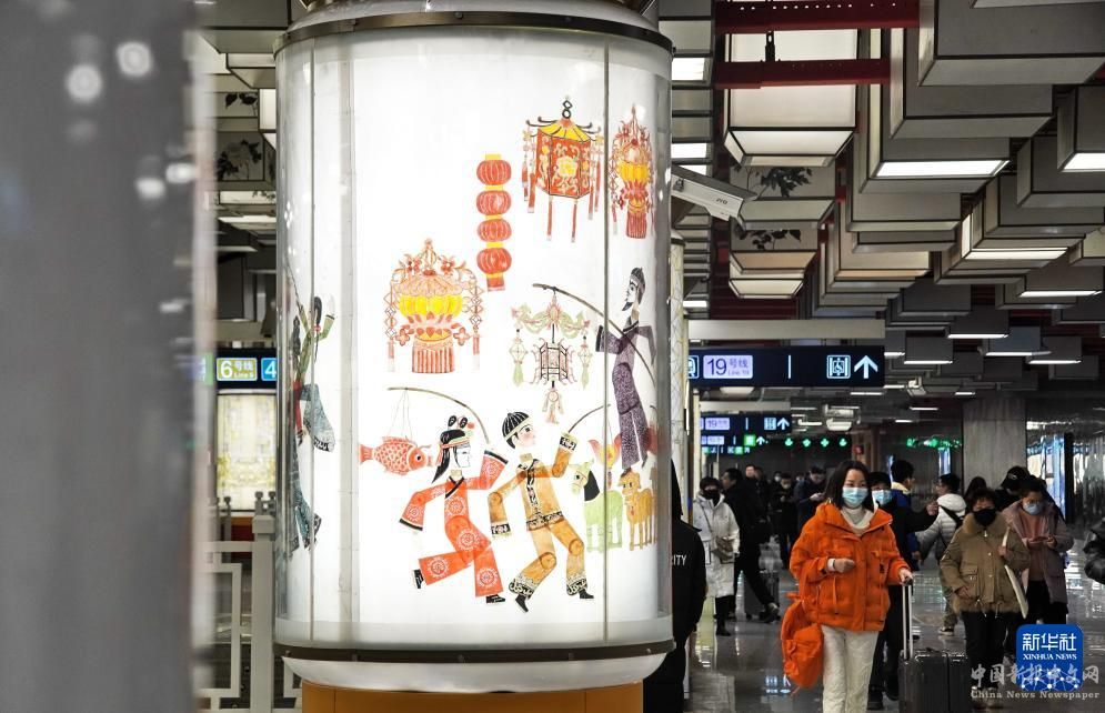 這是平安里地鐵站內(nèi)的中國傳統(tǒng)皮影戲走馬燈燈柱(1月20日攝)。