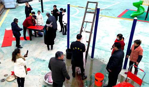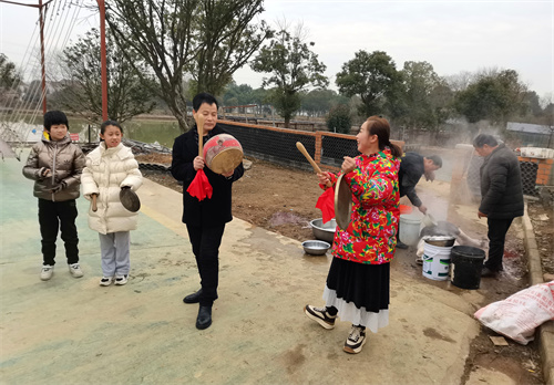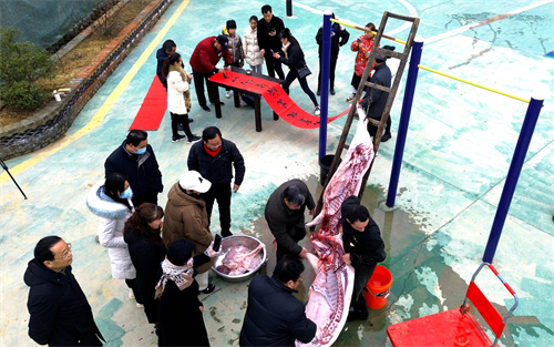 2024年1月27日,安徽省合肥市廬江縣萬山鎮(zhèn)廿埠村,村民吳寶林在屠宰師傅幫助下一起宰殺年豬,書法家擺開筆墨為村民書寫春聯(lián),村民們?cè)诜仲徹i肉,等候書法家手寫的春聯(lián),電商達(dá)人敲鑼打鼓唱起皖中民俗“門歌”,勾勒出一幅濃濃的鄉(xiāng)村年味畫卷。 (巢志斌 攝)