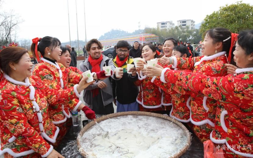 外國(guó)留學(xué)生與村婦們一起吃麻糍。