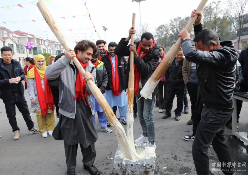 外國(guó)留學(xué)生體驗(yàn)打麻糍。