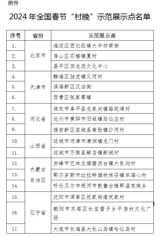 據(jù)文旅部網(wǎng)站消息,根據(jù)文化和旅游部春節(jié)活動(dòng)有關(guān)部署,在各省級(jí)文化和旅游行政部門申報(bào)推薦的基礎(chǔ)上,文旅部研究確定了2024年春節(jié)“村晚”示范展示點(diǎn)名單。具體如下: