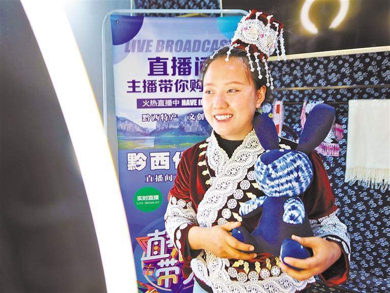 化屋村苗繡車(chē)間負(fù)責(zé)人楊文麗在直播推介文創(chuàng)產(chǎn)品。楊文麗和她的團(tuán)隊(duì)結(jié)合傳統(tǒng)的苗繡、蠟染等手工技藝,創(chuàng)新開(kāi)發(fā)了100多種文創(chuàng)產(chǎn)品,帶動(dòng)了當(dāng)?shù)馗嗬C娘就業(yè)。