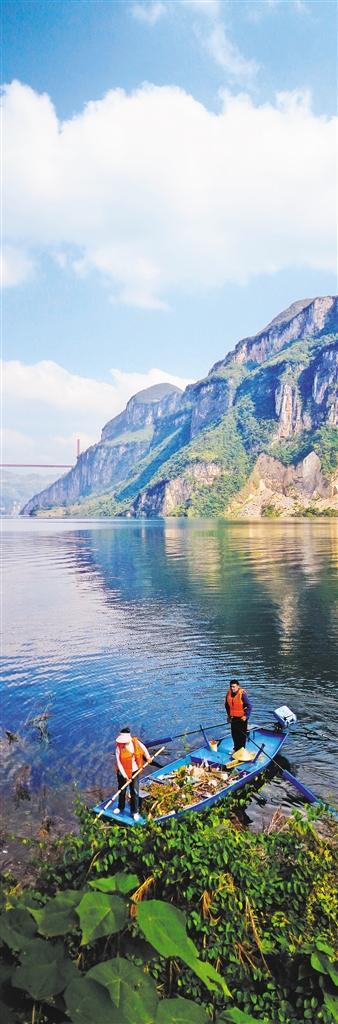 護(hù)河員楊清鑫與妻子駕船在六沖河化屋段打撈漂浮物。化屋村常態(tài)化組織志愿服務(wù)隊(duì)開(kāi)展湖面垃圾清理,堅(jiān)決守護(hù)好烏江母親河。