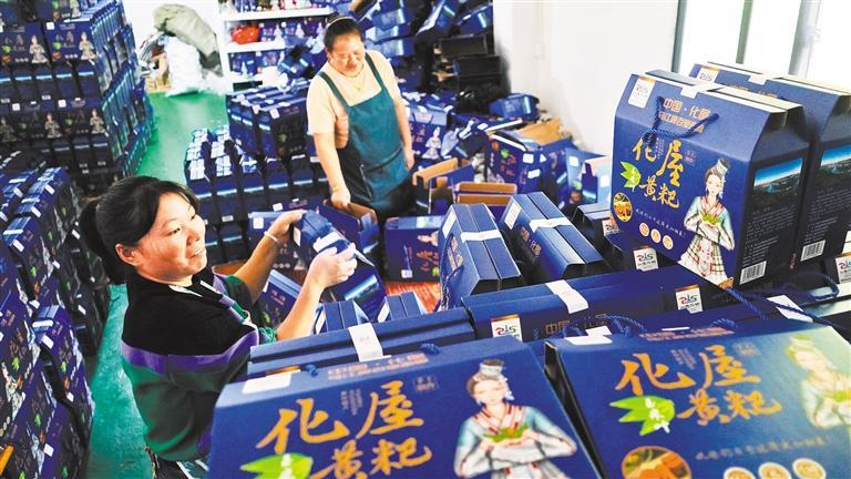 化屋村黃粑加工廠,員工在整理產(chǎn)品。化屋村通過(guò)開(kāi)辦加工廠,打造“化屋黃粑”品牌,讓名不見(jiàn)經(jīng)傳的小吃成為暢銷(xiāo)農(nóng)產(chǎn)品。