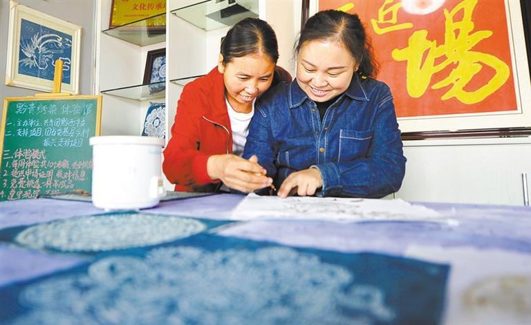 游客在化屋村繡染體驗(yàn)館學(xué)習(xí)蠟染技藝。化屋村通過(guò)開(kāi)辦刺繡蠟染扶貧車(chē)間等方式,傳承和發(fā)揚(yáng)苗族文化,助力村民增收。