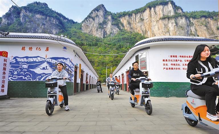 游客騎著共享電動(dòng)車(chē)在化屋村游覽?;荽逶诖謇锓胖昧税倥_(tái)共享電動(dòng)車(chē),供游客享受“畫(huà)廊暢騎之旅”。