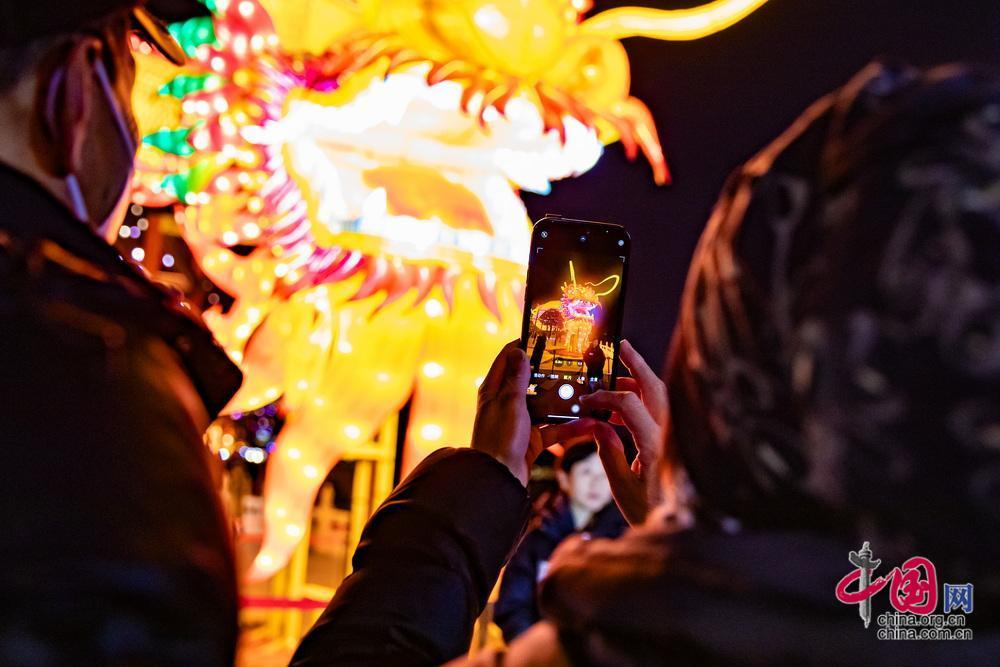 市民在巨龍燈前拍照留念。中國(guó)網(wǎng)記者 鄭亮攝