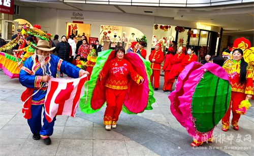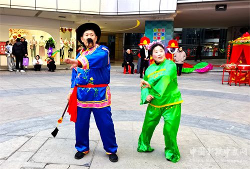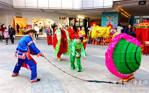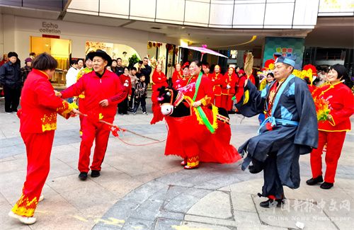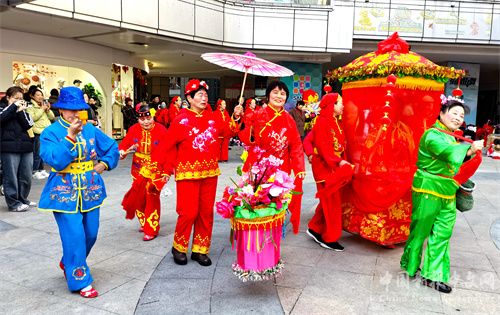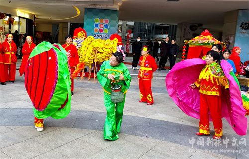 2024年2月12日,正月初三,安徽省合肥市廬江縣白山鎮(zhèn)姐妹花藝術(shù)團(tuán)來到縣城商業(yè)綜合體安德利廣場,表演旱地行舟、河蚌舞、挑花挑、花式鑼鼓、抬大花轎、花鼔唱等民俗節(jié)目,吸引了許多市民前來欣賞演出,感受民俗營造的濃濃“年味”。 (巢志斌 攝)