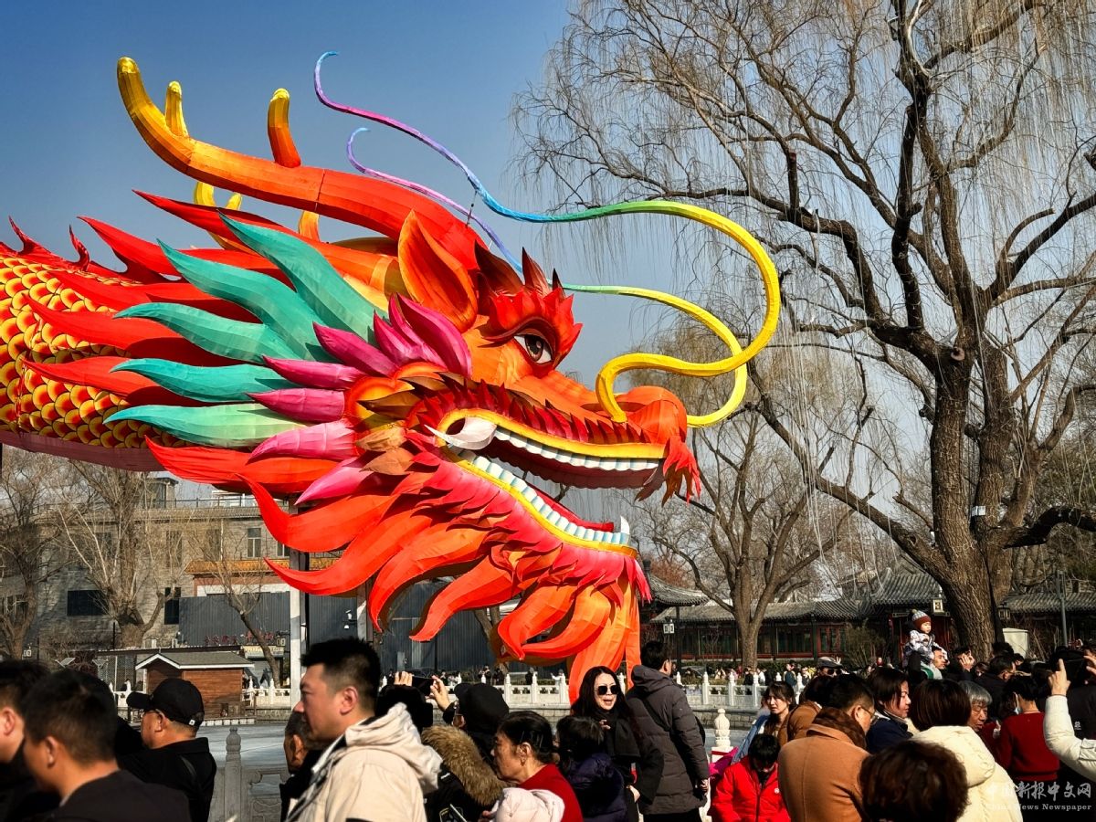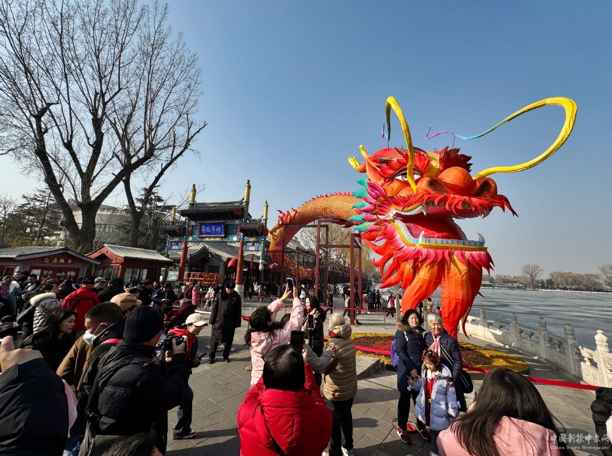 2月12日,在什剎海畔的荷花市場(chǎng),“蛟龍出海”巨型龍燈吸引眾多市民游客。中國(guó)日?qǐng)?bào)記者 杜漣猗 攝