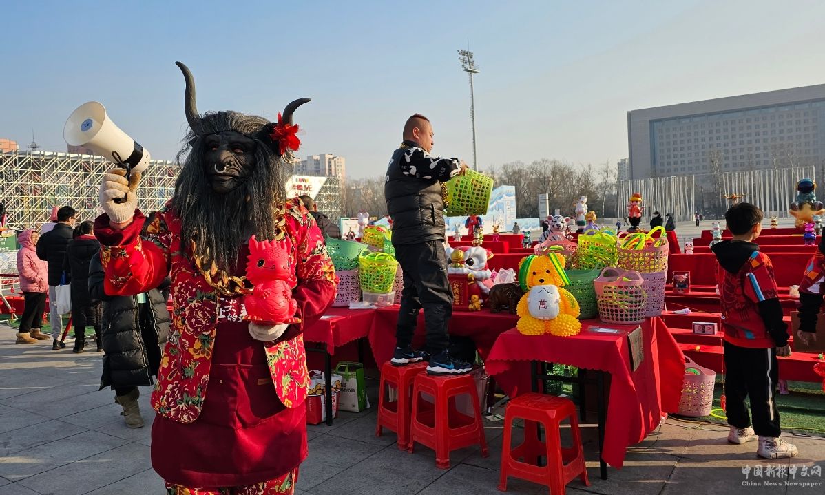 2月12日,在五棵松華熙LIVE新春嘉年華上,工作人員身著“爾濱花棉襖”,裝扮成“牛魔王”招攬顧客。中國(guó)日?qǐng)?bào)記者 耿菲菲 攝