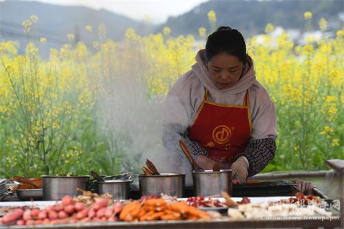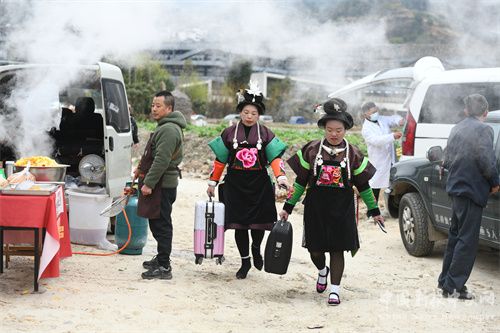記者走進平中社區(qū)看到,從村口到蘆笙堂,公路兩旁車輛、攤子排起了“長龍”,一公里多長,小攤小販忙著煮米粉、搞燒烤、稱米花糖……感受到了熱騰騰的煙火氣和濃濃的年味。