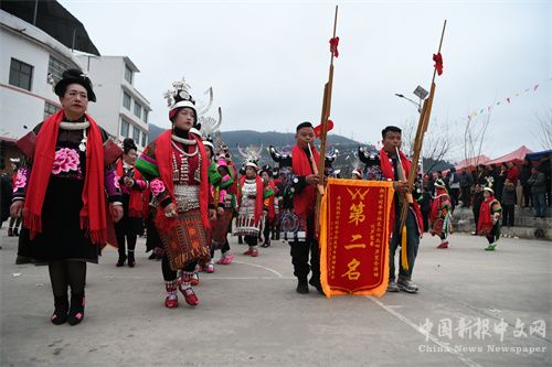 天黑了,路燈亮了。突然,一陣鞭炮聲中,舟溪鎮(zhèn)苗嶺村蘆笙隊將榮獲“第二名”的錦旗掛在蘆笙上,跳起了銅鼓蘆笙舞,大家臉上洋溢著勝利的笑容。