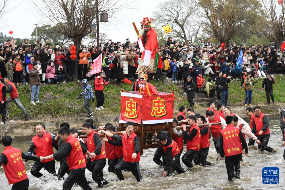 2月24日,福建省連城縣羅坊鄉(xiāng)走古事隊伍蹚著清巖河水前行。