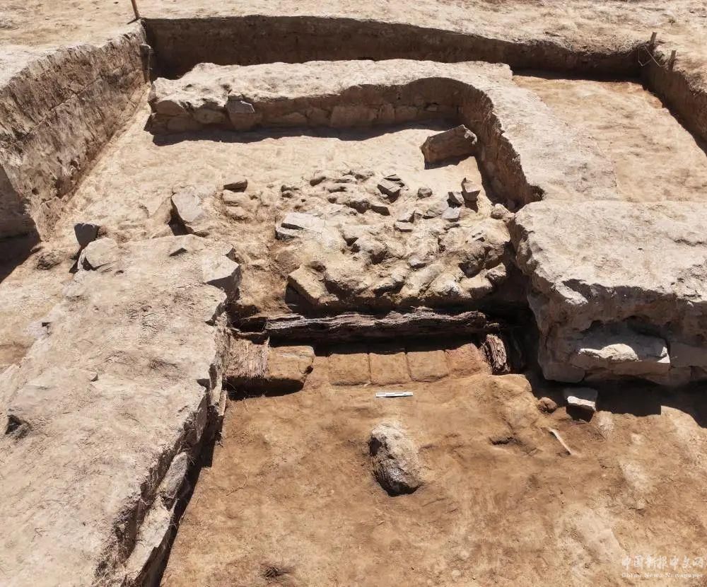 此外,考古隊員在最大的房址發(fā)現(xiàn)方形磚砌祭臺。專家表示,磚砌祭臺屬熱水墓群中的首次發(fā)現(xiàn),祭臺中發(fā)現(xiàn)大量磚塊。通過陵園及祭祀建筑的規(guī)模、數(shù)量等線索推測,這個墓葬的規(guī)格、墓主人的身份等級要高于2018血渭一號墓。