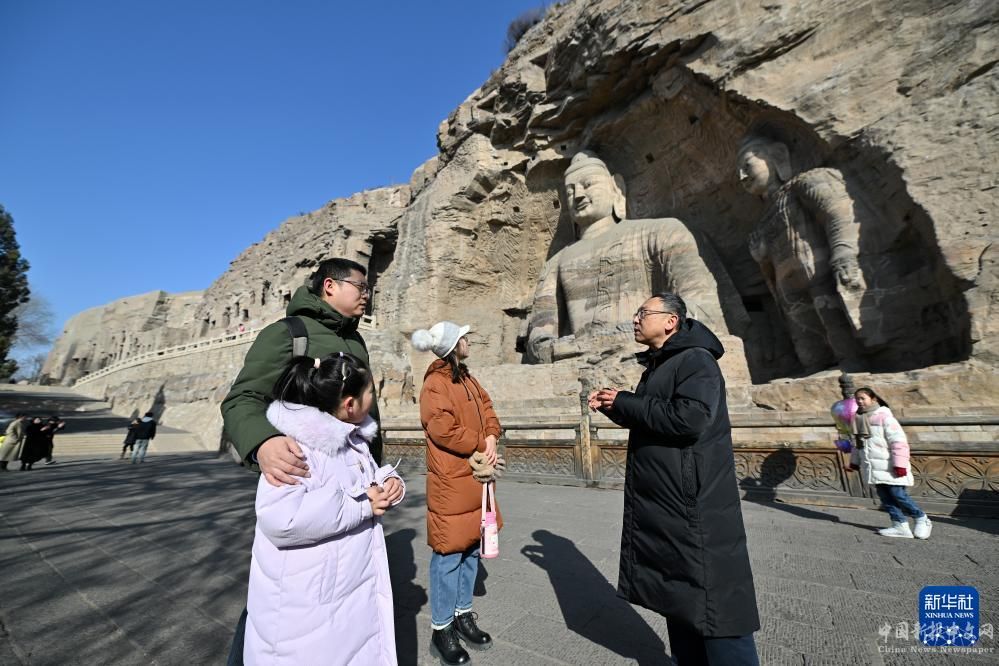 杭侃(右)在給游客講解云岡石窟的歷史知識(shí)(2月25日攝)。
