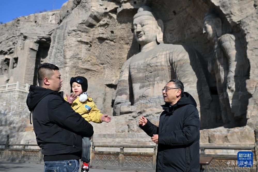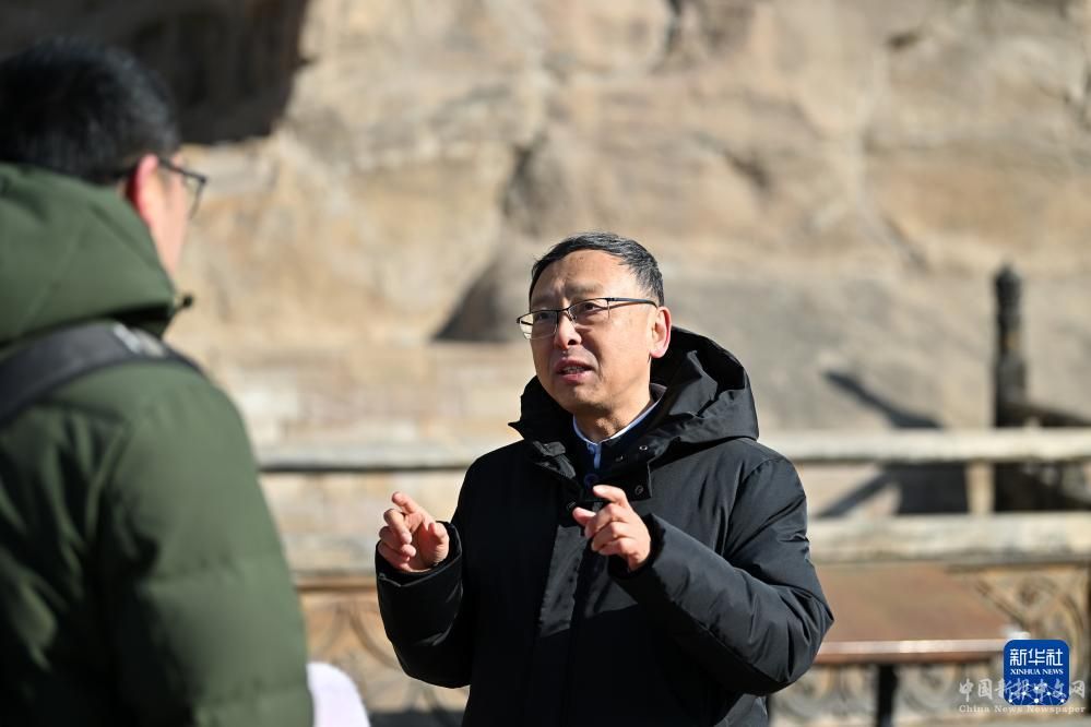 杭侃(右)在云岡石窟調(diào)研走訪,了解游客的需求(2月25日攝)。
