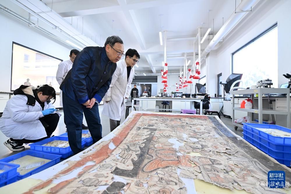 在云岡研究院壁畫文物修復(fù)室,杭侃(左三)和同事交流壁畫修復(fù)方案(2月25日攝)。