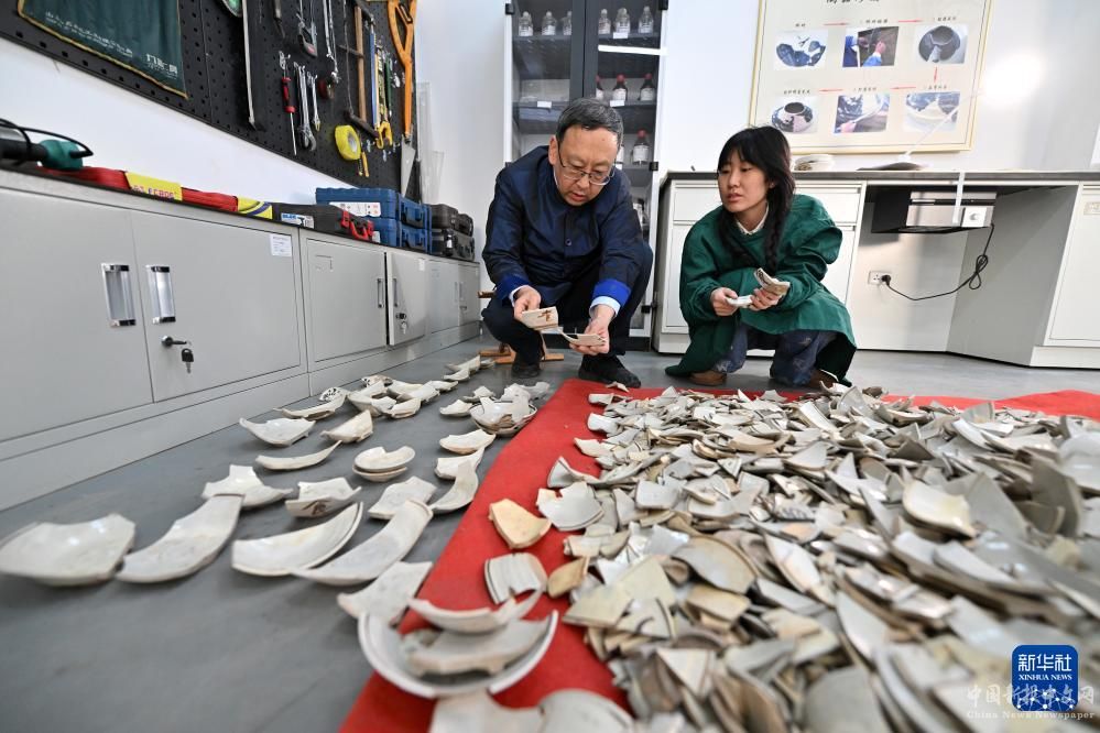 在云岡研究院可移動(dòng)文物修復(fù)室,杭侃(左)和同事交流瓷器修復(fù)方案(2月25日攝)。