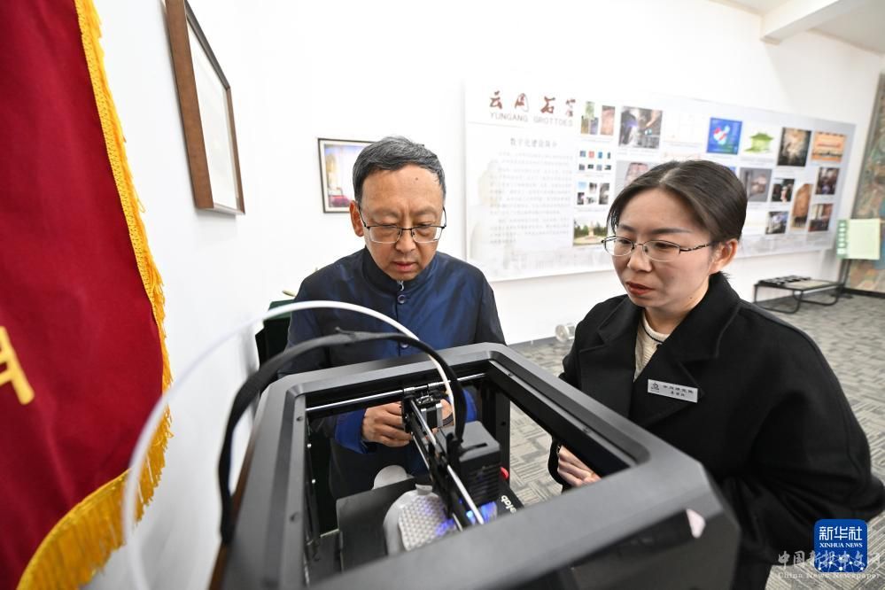 在云岡研究院數(shù)字化保護(hù)中心,杭侃(左)和同事交流文創(chuàng)產(chǎn)品設(shè)計(jì)方案(2月25日攝)。