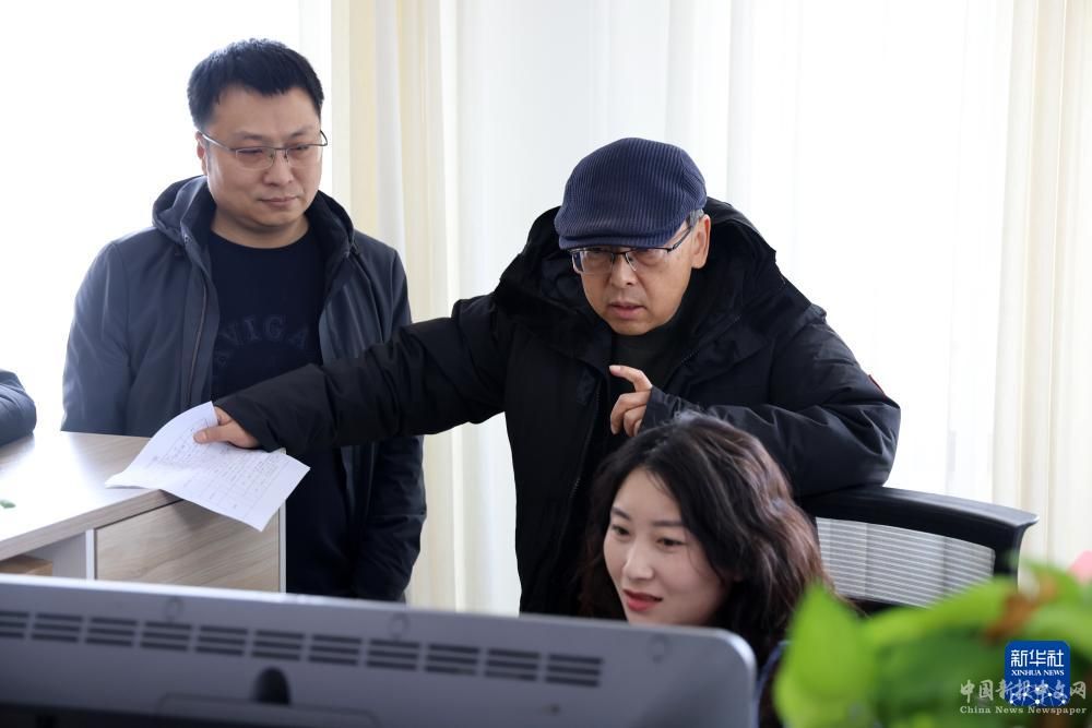 在云岡研究院數(shù)字化保護(hù)中心,杭侃(中)和同事交流云岡石窟數(shù)字化技術(shù)采集方案(2023年12月29日攝)。