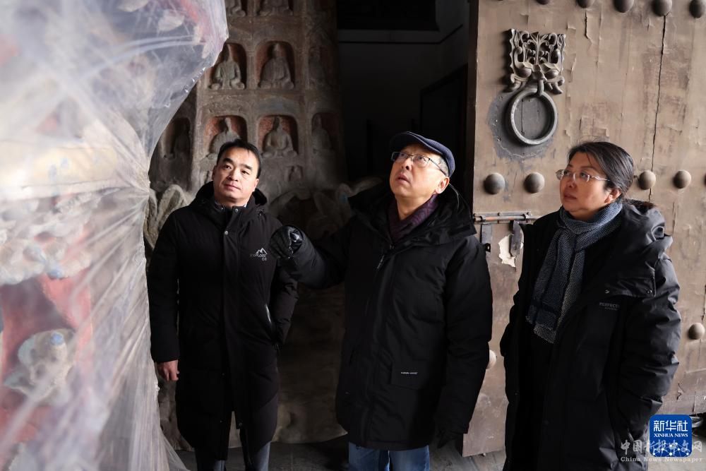 杭侃(右二)在云岡石窟調(diào)研走訪,了解游客的需求(2月25日攝)。