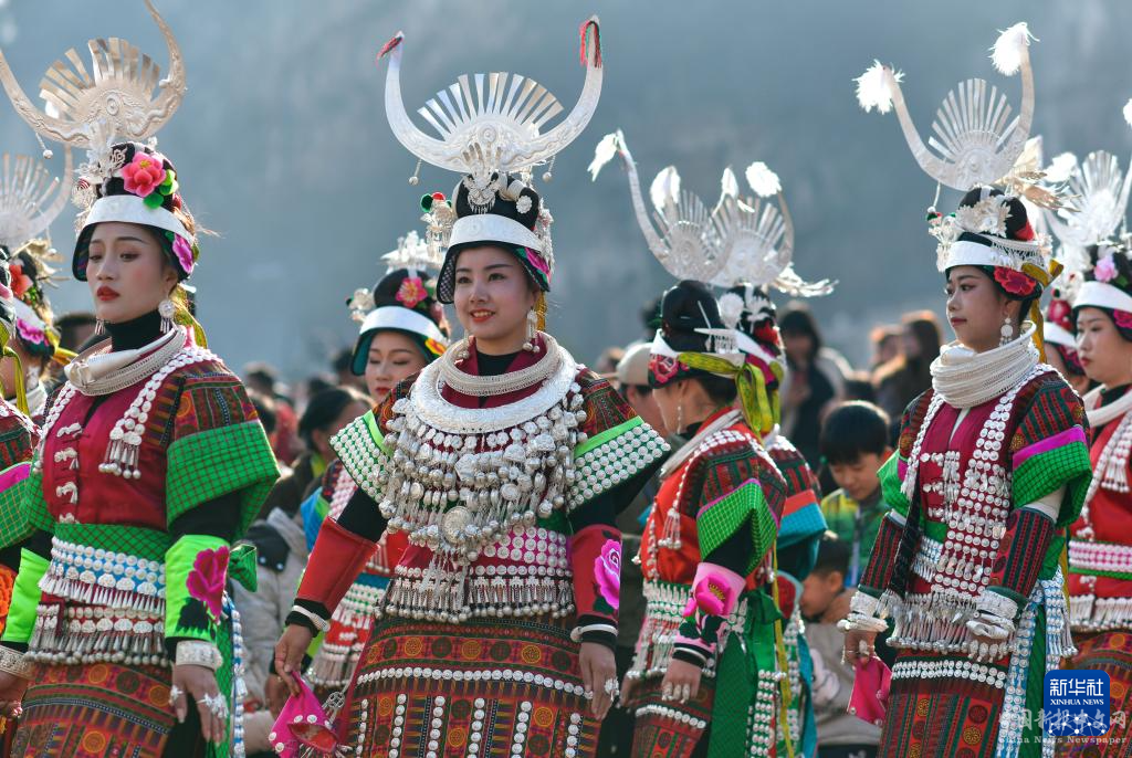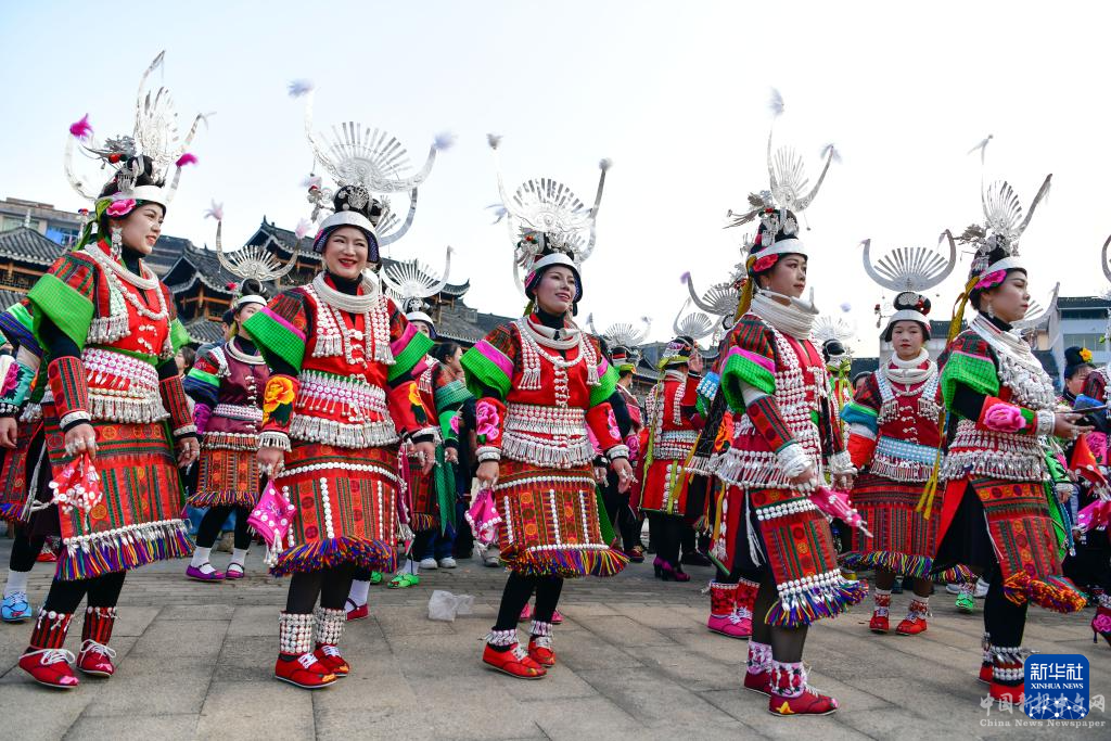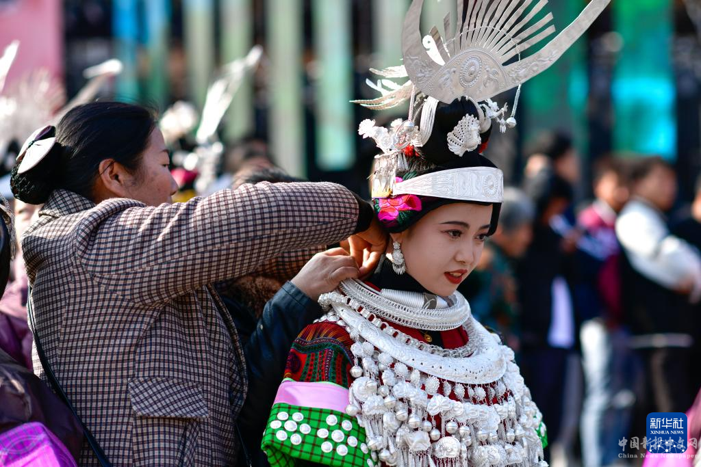 3月2日,在貴州省凱里市舟溪鎮(zhèn),苗族姑娘身著盛裝跳起蘆笙舞。