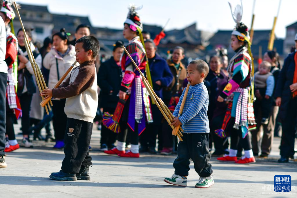3月2日,在貴州省凱里市舟溪鎮(zhèn),小朋友在吹奏蘆笙。
