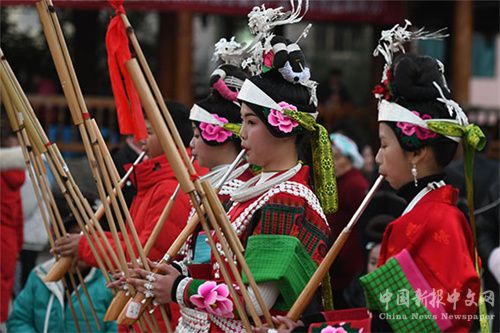 2024年3月2日,在貴州省凱里市舟溪鎮(zhèn),苗族姑娘小伙一起吹奏蘆笙。(楊仁海 攝)