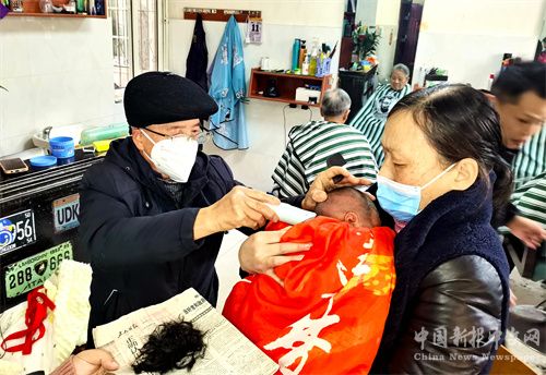 2024年3月11日,農(nóng)歷二月初二,安徽省合肥市廬江縣廬城鎮(zhèn)工行巷父子理發(fā)店,理發(fā)師朱和生和女兒朱曉倩、女婿汪崤晨忙著為嬰兒剃胎毛。