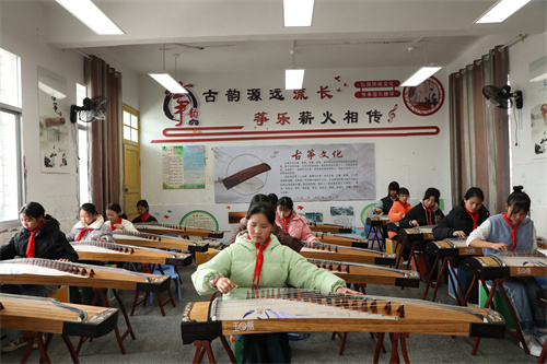 3月26日,在湖南省保靖縣毛溝小學(xué),教師在引導(dǎo)學(xué)生練習(xí)彈奏古箏。近年來(lái),該校古箏、二胡、笛子等傳統(tǒng)民族樂(lè)器演奏融入學(xué)校課堂教學(xué)和課后服務(wù),引導(dǎo)學(xué)生學(xué)習(xí)民族樂(lè)器演奏技巧,激發(fā)學(xué)生熱愛(ài)民族樂(lè)器、傳承民族文化的熱情。(俞采華 彭賢夢(mèng))