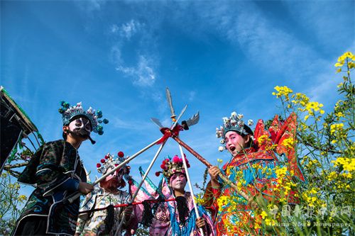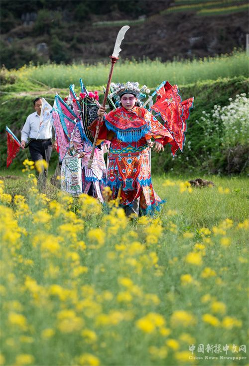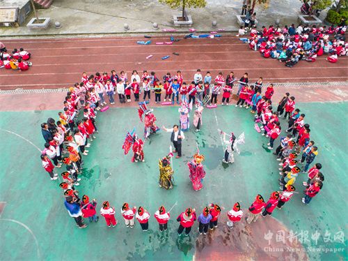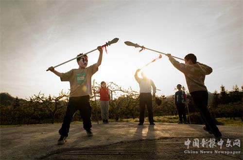 “好!好!精彩!”貴州省天柱縣渡馬鎮(zhèn)巖門村桃花李花盛開時(shí)節(jié),渡馬小學(xué)少年宮侗戲班的孩子,在指導(dǎo)老師的帶領(lǐng)下,在桃李園里排戲。孩子們嫻熟的打斗動(dòng)作,婉轉(zhuǎn)的唱腔,贏得了看客陣陣叫好。