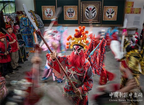 談到學(xué)習(xí)侗戲的目的,孩子們的學(xué)習(xí)動(dòng)機(jī)都滿滿正能量。六(1)班的楊樹,學(xué)戲已經(jīng)3年,畫的趙子龍臉譜,身著白袍,手執(zhí)“銀槍”,渾身透著干練。他說:“我不想沉迷于手機(jī)游戲,讓眼睛過早地近視。”很難想象,在人人迷戀手機(jī)游戲的年代,一個(gè)12歲男孩會(huì)說出這樣的話。六(3)班的羅朝俊,已有2年戲齡,男扮女裝,身穿刀馬旦鎧甲,背插紅色間藍(lán)靠旗,一股英姿颯爽氣勢(shì)。他表示,學(xué)習(xí)穆桂英、梁紅玉、花木蘭等古代名將,長(zhǎng)大從軍,保家衛(wèi)國(guó)。五(3)班的楊艷芳,扮演穆桂英,左手擎大刀,右手反手抽出背旗,當(dāng)令旗使用,指揮將士們“旗進(jìn)則進(jìn),旗退則退”。她認(rèn)為,侗戲是中國(guó)傳統(tǒng)文化的藝術(shù)瑰寶,博大精深,能激發(fā)民族自豪感,要傳承下去。