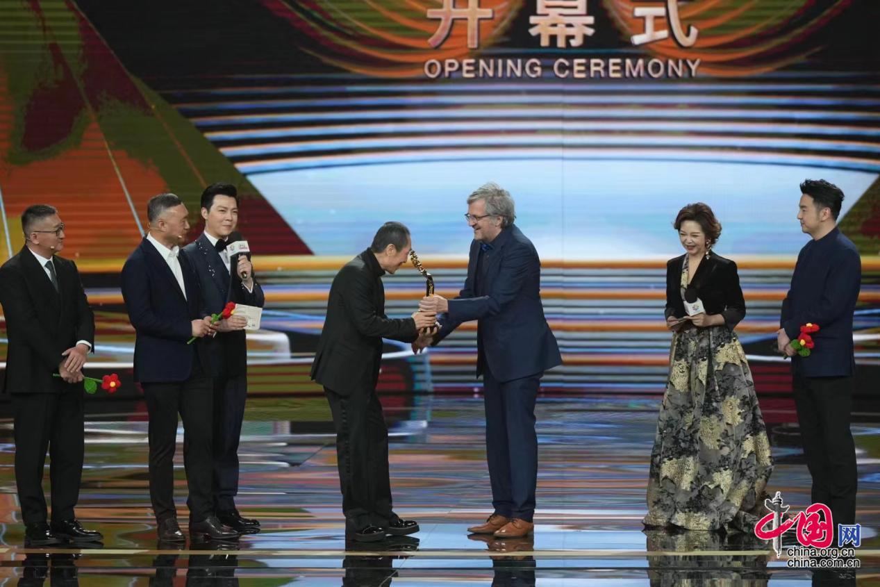 埃米爾·庫(kù)斯圖里卡為中國(guó)導(dǎo)演張藝謀頒發(fā)組委會(huì)特別榮譽(yù)獎(jiǎng)。攝影 崔峻