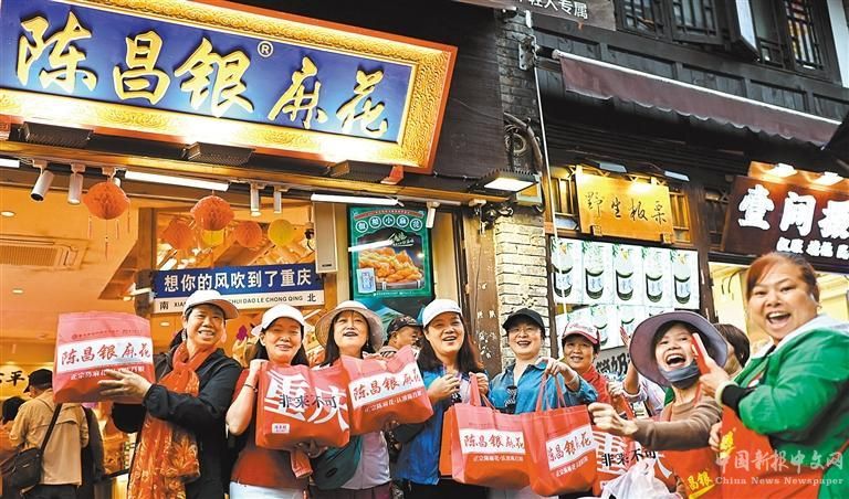 4月16日,游客在重慶市沙坪壩區(qū)磁器口歷史文化街區(qū)的陳昌銀麻花店拍照留念。傳承百年的老字號(hào)經(jīng)過(guò)創(chuàng)新發(fā)展,不斷煥發(fā)活力。