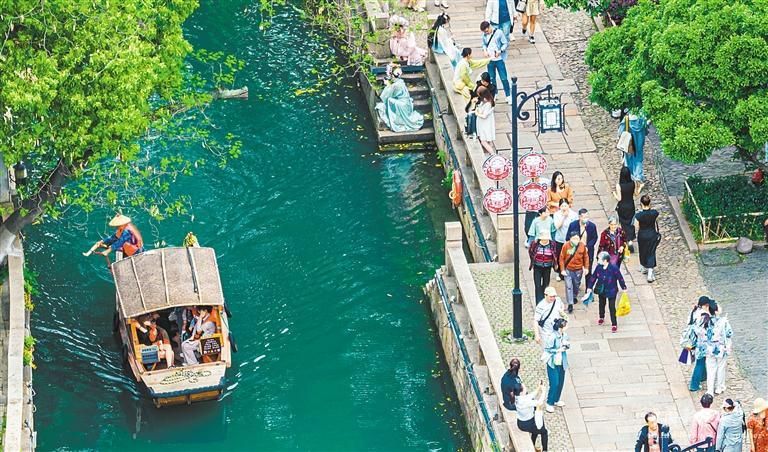 4月25日,游客在江蘇省蘇州市平江歷史文化街區(qū)游玩。蘇州深入挖掘歷史街區(qū)和歷史建筑文脈內(nèi)涵,高質(zhì)量、精細(xì)化推進(jìn)街區(qū)保護(hù)更新工程,吸引大批游客前來(lái)觀光。
