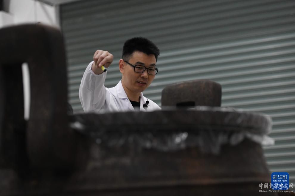 5月20日,武王墩考古項(xiàng)目實(shí)驗(yàn)室負(fù)責(zé)人張治國(guó)在介紹出土文物。