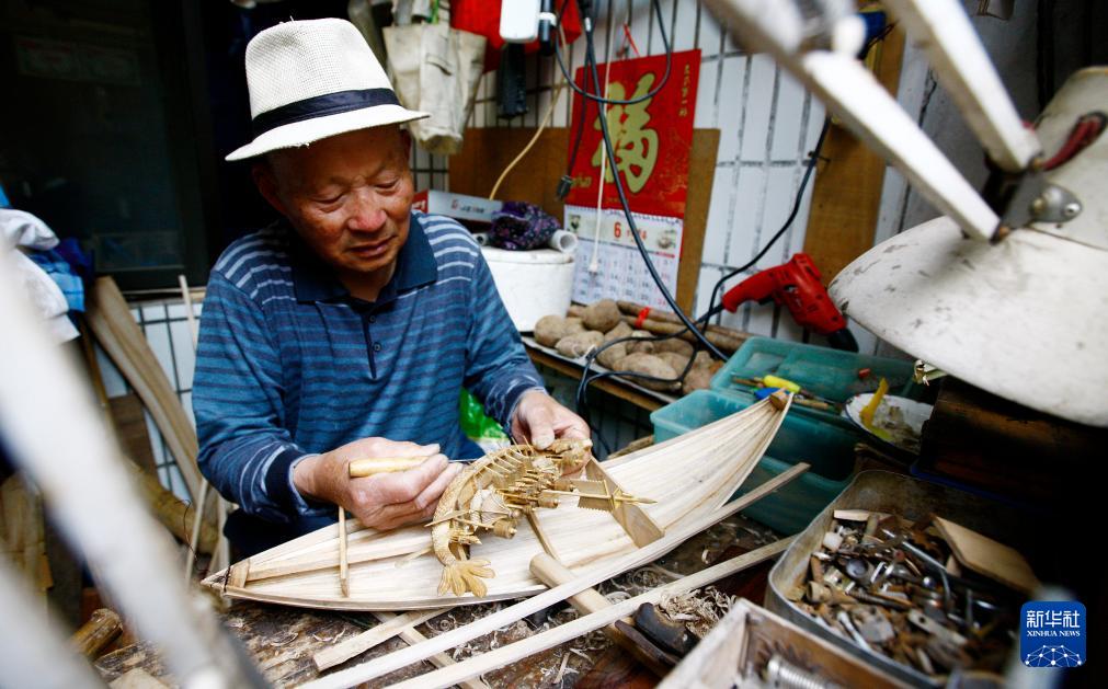 6月4日,張國(guó)忠在羅店龍船非遺文化工作室內(nèi)制作木雕龍船模型。