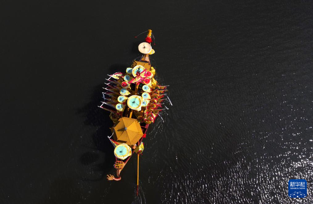 6月6日,一條羅店龍船航行在上海寶山美蘭湖水面上(無(wú)人機(jī)照片)。
