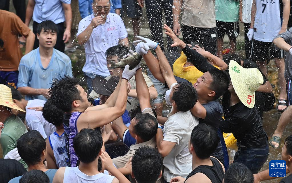 7月21日,在融水苗族自治縣紅水鄉(xiāng)良雙村鬧魚節(jié)活動中,村民和游客在河里抓魚。今年,良雙村利用粵桂協(xié)作資金,對河道進行了整治和改造,提升旅游基礎(chǔ)設(shè)施條件。