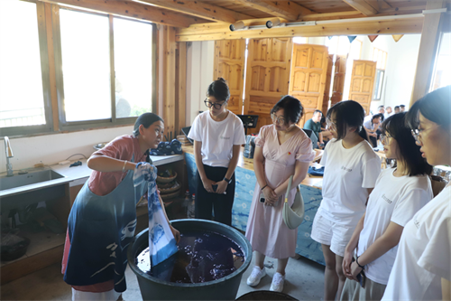 非遺是一代人的傳承,一群人的情懷,一個(gè)民族的標(biāo)志。鄉(xiāng)村振興與非遺傳承密不可分,相輔相成,鄉(xiāng)村富起來(lái),非遺才能活起來(lái)。為了更好地了解花瑤非遺的起源和傳承,啟航團(tuán)隊(duì)成員首先拜訪(fǎng)了植物染技藝傳承人米蘭?;ì幹参锶九c花瑤挑花一樣,都是一項(xiàng)傳承千年的技藝。花瑤植物染與其他扎染不同的是植染所用的染料全都取于植物,是最自然的染色方法。米蘭女士詳細(xì)介紹了植物染色的精細(xì)流程,并現(xiàn)場(chǎng)展示了其精湛技藝。她坦誠(chéng)向隊(duì)員們分享了傳承過(guò)程中所面臨的挑戰(zhàn),并強(qiáng)調(diào)表示,非遺需要一代代人不斷傳承,正是出于對(duì)這門(mén)古老藝術(shù)的熱愛(ài),她才會(huì)堅(jiān)定地承擔(dān)起傳承重任。