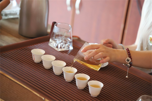 緊接著,譚霞女士帶領(lǐng)團(tuán)隊(duì)來(lái)到了茶室。在雅致的茶室中,譚霞女士為團(tuán)隊(duì)詳細(xì)展示了虎久霧語(yǔ)的泡茶技藝。她手法嫻熟,茶香四溢,茶藝之精美令人嘆為觀(guān)止。團(tuán)隊(duì)成員品嘗地道虎久霧語(yǔ)茶后,對(duì)茶文化有了更深入的了解,感受到茶香中的歷史與文化。