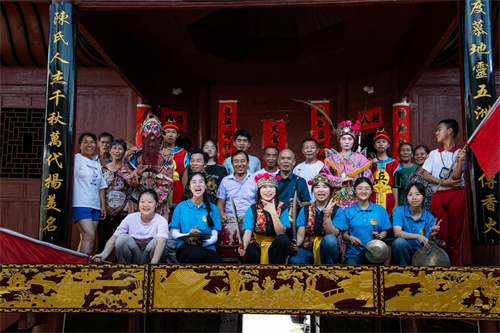 天柱縣渡馬鎮(zhèn)龍盤村陳氏家祠內(nèi),學(xué)員與戲師合影。
