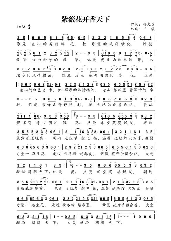 正是面對如此宏闊的自然與人文背景,基于這樣的認識和思考,本歌曲詞作者楊文國先生,作為生長于此、十分熟悉并熱愛這片沃土熱土,作為以歌曲《信仰》榮獲全國五個一工程獎的詞作者,他大膽自信地以邵陽市市花紫薇花為主體形象主要意象進行主題開掘,將五位一體的文明建設內(nèi)涵體現(xiàn)在作品之中,以紫薇花開香天下的歷史自信將本屆旅發(fā)大會主打歌曲升華創(chuàng)作成了新時代邵陽文明城市建設的主題歌。旨在激勵邵陽各族群眾像紫薇花一樣以奮斗與奉獻精神品格貢獻于偉大新時代之邵陽家鄉(xiāng)。作品在唱段的處理上,也緊扣主題主旨獨運匠心。第一唱段將丹霞崀山、云上花瑤、紅色南山、雪峰鐵杉四個板塊徐徐展開,鋪陳展示出大美邵陽主體風貌。第二樂段則突出文明建設兩個主題層次、本屆旅發(fā)大會主辦地紅色南山苗鄉(xiāng)城步和代表全市其它區(qū)域的雪峰鐵杉兩個板塊,并作重復詠嘆,凸顯了本屆旅發(fā)大會的主體主陣和闊步走向未來的文明建設主題主調(diào)。