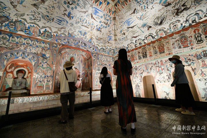 2024年6月7日,在敦煌石窟文物保護(hù)研究陳列中心,游客參觀莫高窟復(fù)制洞窟第276窟壁畫(huà)。新華社記者 郎兵兵 攝