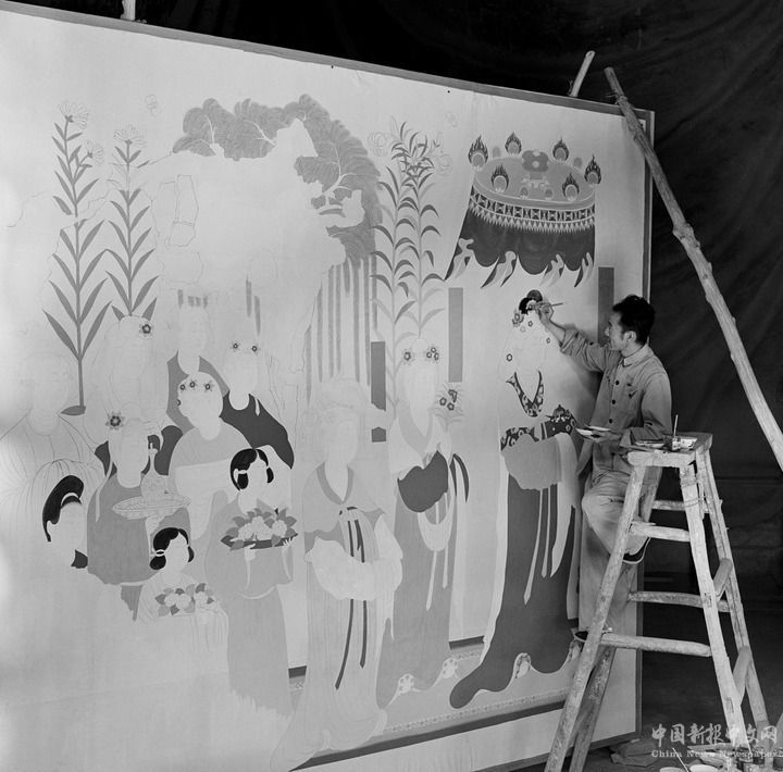 1944年,國(guó)立敦煌藝術(shù)研究所在大漠中成立。那時(shí),莫高窟已荒廢近400年。流沙從崖壁頂部?jī)A瀉而下,上百個(gè)洞窟被掩埋。壁畫(huà)大塊跌落,砸爛在地上。
