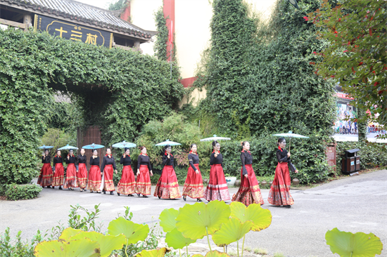 來自云溪區(qū)金昇藝術團模特學員們身著禮服、手持紙傘,在團長陳丹指揮下,在集歷史、人文、自然于一體的園林式廠區(qū)內,邁著優(yōu)雅的“貓步”走秀展示,盡情享受無限秋光,演繹了一場文化盛宴,秀出十三村生態(tài)和美。