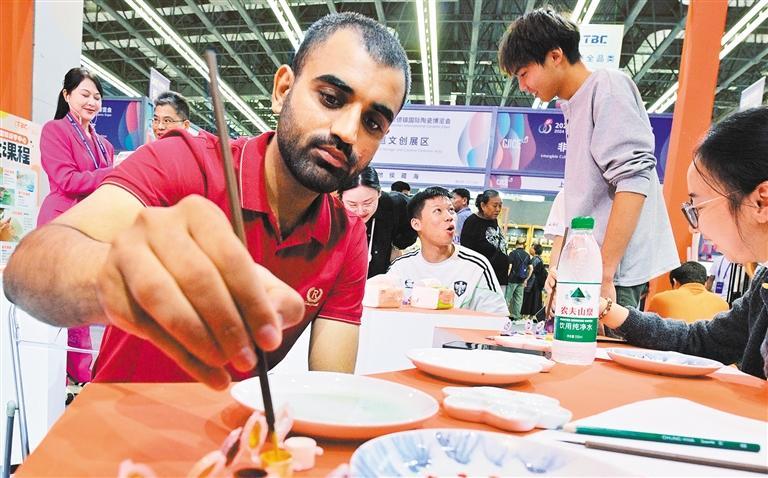 10月19日,外國游客在景德鎮(zhèn)國際陶博城主會場體驗畫陶瓷。瓷博會正在成為生動展示國家陶瓷文化傳承創(chuàng)新試驗區(qū)建設成果的獨特窗口、陶瓷行業(yè)“買全球、賣全球”的開放平臺。楊繼紅攝(中經(jīng)視覺)